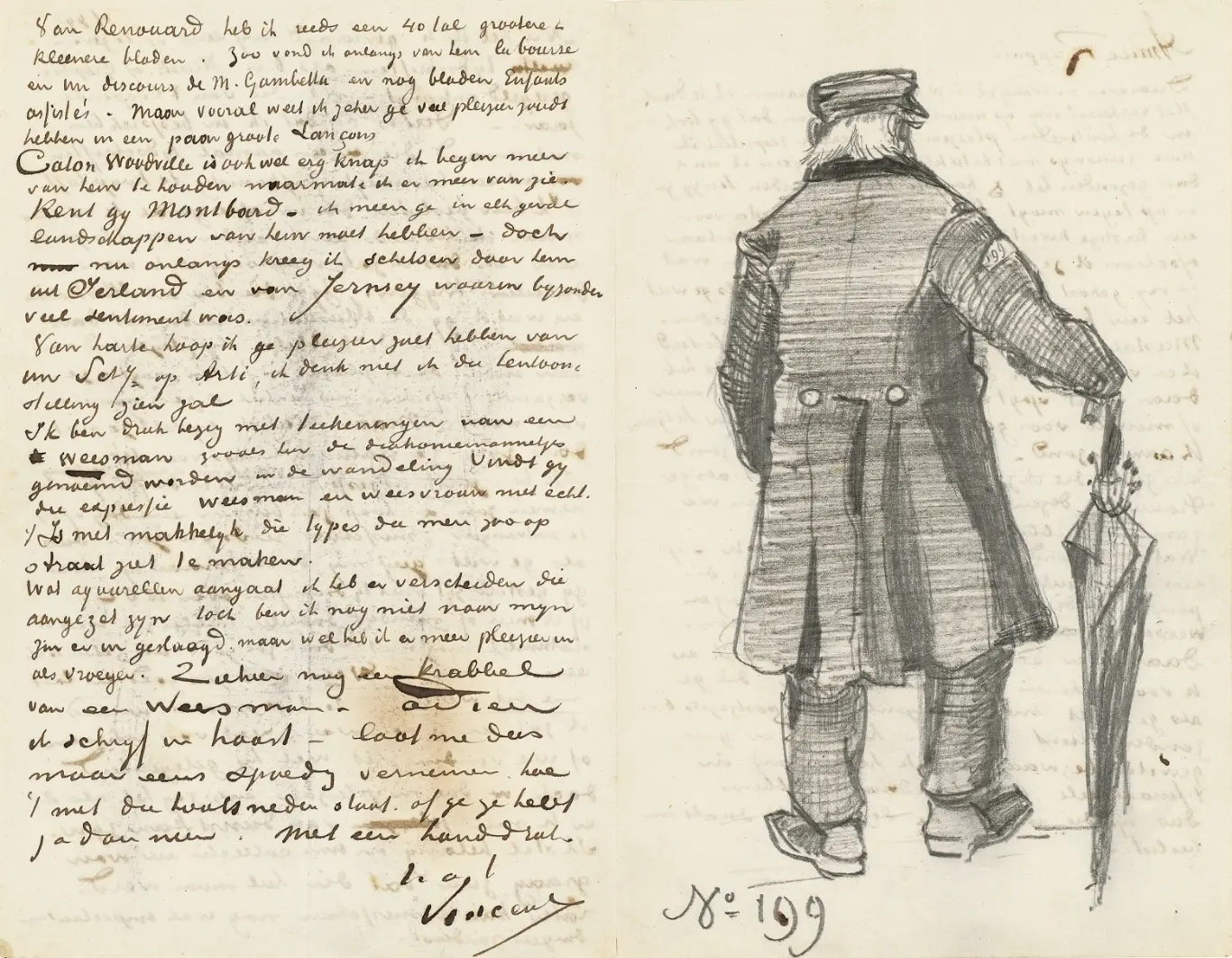 「傘を持つ老人の後ろ姿が描かれたアントン・ファン・ラッパルト宛ての手紙」